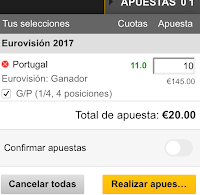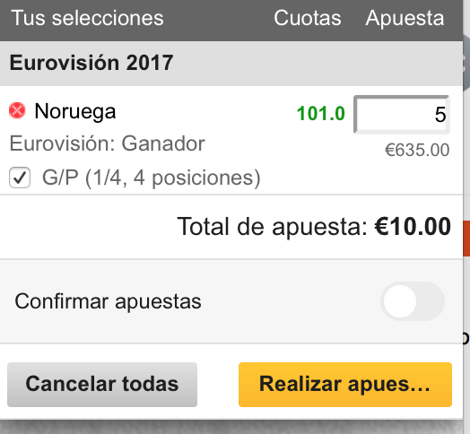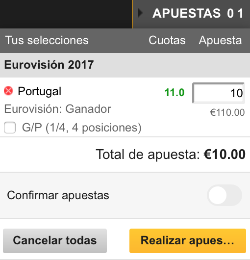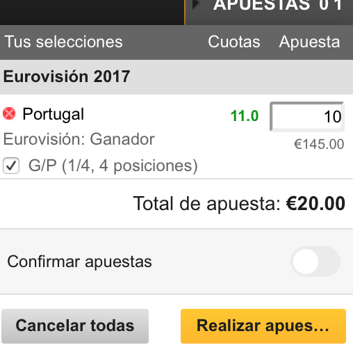 Hay otra opción además de jugar solo a ganador. Y lo veis debajo que pone G/P (1/4, 4 posiciones). Bien, en algunos casos, y este es el caso de Eurovisión, podemos presumir que en una competición tan abierta donde hay 26 posibles ganadores, también tiene su mérito que la opción que yo he elegido como triunfadora quede entre los 4 primeros puestos. Esto implica irremediablemente pagar el doble por la apuesta para beneficiarnos de este aumento de probabilidades de acierto y la diferencia obtenida si Salvador Sobral queda 1º, 2º, 3º o 4º tampoco es tan jugosa: 35€ más tras haber abonado 20€ por apostar que quedará entre los 10 primeros. Está cantidad varía porque es más fácil que un favorito quede entre los 4 primeros. Vamos a verlo con un país no favorito.