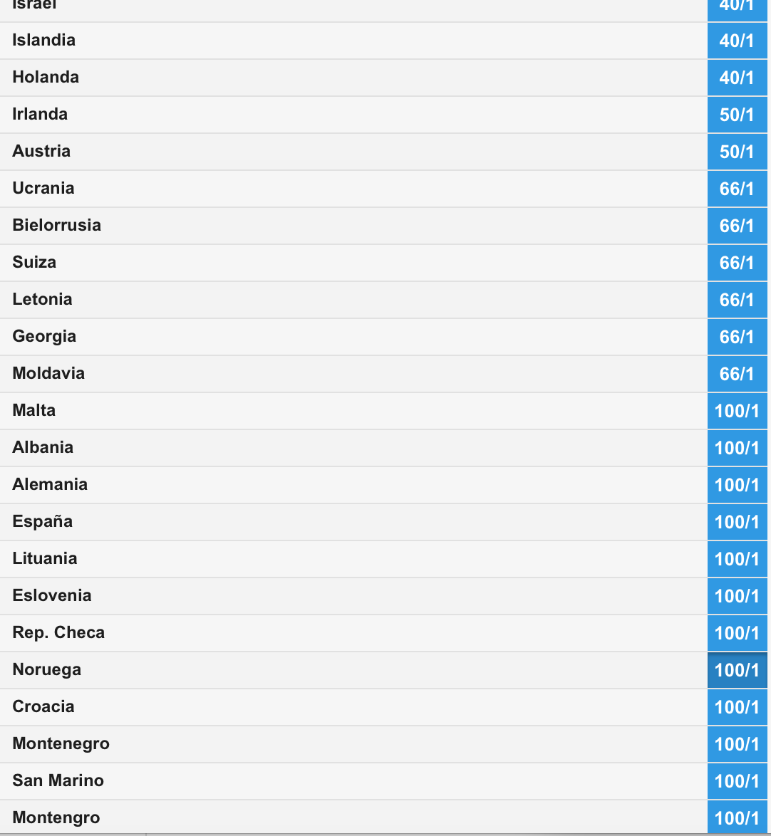 En esta vista, al lado de cada país aparece un número decimal. Eso significa la cantidad que te pagará la casa de apuestas por cada euro apostado a la victoria de ese país.