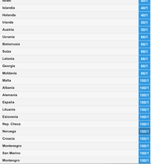 Betfair paga la victoria de Noruega a 100/1 o 101 , una cuota altísima, como si fuera imposible que el electropop de JOWST venciese. Bueno, quizás no gane, pero al igual que el año pasado Bulgaria, una canción de estética moderna, bien interpretada y con puesta en escena llamativa puede quedar ‘fácilmente’ entre los cuatro primeros. Sin embargo, Noruega no es favorita para nada. De esta manera si yo apostase 5€ a que Noruega ganase, obtendría de vuelta 505€. Ahora bien, si yo apuesto a que quedará entre los 4 primeros, me costará 10€ ‘meter’ esa posibilidad pero a cambio recibiría 130€ para cobrar en total ¡¡635€!! tras haber apostado tan solo 10€ si los noruegos quedan, por ejemplo, cuartos. Os dejamos los países ‘menos favoritos’ por si entre ellos habéis visto al ‘dark horse’ o ‘tapado’ de este año y os queréis costear unas buenas vacaciones.