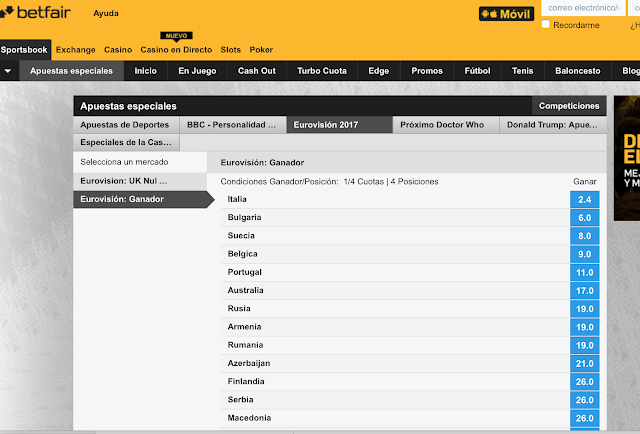 De esta manera, muchos, antes de 2011, encontrábamos fácil apostar en casas de apuestas inglesas online sin tener luego que justificar ante Hacienda nada. Hoy en día apostar en una casa de apuestas fuera de España es legalmente imposible. Y esto implica que un mercado como el de Eurovision en nuestro país apenas tenga predicamento entre las casas de apuestas. A día de hoy solo betfair.es ofrece la posibilidad de hacerlo para este 2017. Y estas son las cuotas que se pagan a día de hoy: