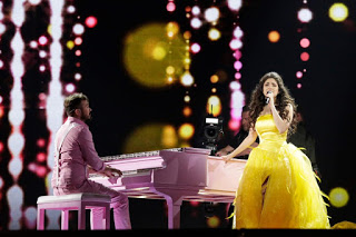 Estonia: Potentes focos desde atrás en perfecta simbiosis con una elegantísima Laura de blanco significan el inicio del número. Posteriormente, vemos a Koit andando con un camino luminoso que se abre a sus pies. Muchos plano contra plano de los dos intérpretes de cintura para arriba. Con unas voces casi perfectas, el dúo ha ganado en complicidad.