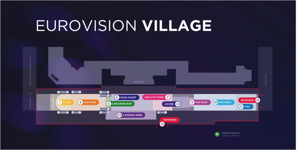 En esta edición el Eurovillage no será una plaza, sino una avenida, la Khreschatyk que ya acogió la Fan Zone durante la Eurocopa de 2012. El espacio total de los diferentes espacios será de 13000 metros cuadrados, habrá emplazadas 4 pantallas gigantes para presenciar todos los eventos televisados y la entrada será gratuita.