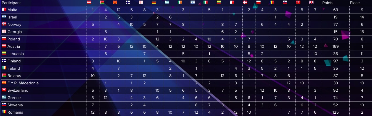 Hay que alabar en cualquier caso además la transparencia de la EBU en los datos de las votaciones que se nos han comunicado este año: no solo sabemos cómo votó cada país en su división televoto-jurado, sino incluso como votó cada miembro del jurado de cada país. Y todo esto el día posterior a la celebración del festival. Inaudito. También sabemos que los votos de Albania y San Marino se deben únicamente al jurado y que las votaciones del jurado de Georgia fueron anuladas, por una inusual concordancia entre todos sus miembros.