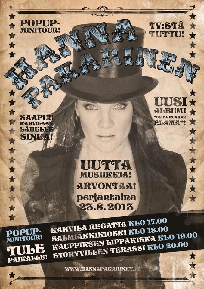 La ganadora de la primera edición de Idols en Finlandia el año 2004 y representante de su país en el festival que organizó la televisión finlandesa en 2007 está a punto de lanzar su sexto álbum de estudio. El próximo 23 de agosto, día del lanzamiento oficial dará cuatro mini-conciertos en varios cafés de la ciudad, incluyendo el Kauppiksen lippis situado en un tradicional quiosco de madera de los cuales se conservan varios en Helsinki y que fueron construidos entre los años cuarenta y cincuenta.