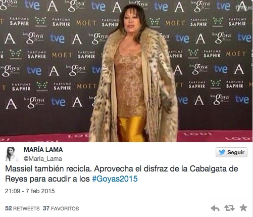 La eurovisiva Massiel se paseó por la alfombra rosa de los premios Goya concedidos anoche en Madrid con uno de los modelitos más criticados de la noche, según recoge en su edición digital 20 minutos. Conjugó varias tonalidades marrones entre sus pantalones, blusón, chal, guantes, bolso de mano y abrigo, levantando numerosas críticas en las redes sociales. Pocos conocen la faceta interpretativa de Massiel, pero ha dado vida a numerosos personajes del cine español en cintas como Vestida de novia (1967), Codo con codo (1967), Cantando a la vida (1969), El taxi de los conflictos (1970) o La vida alegre (1987).