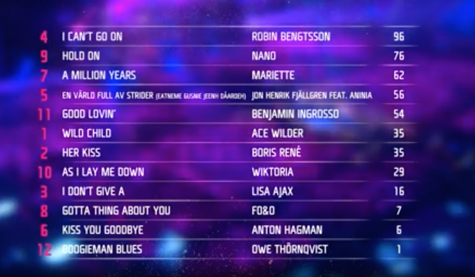 En fin, un resultado divido entre jurado y televoto, aunque solo en matices. La mayor diferencia está en Wiktoria, que se vio perjudicada en su resultado final, y obviamente en el ganador, pero con solo 7 puntos de diferencia. Nano obtuvo el 11,9% de los votos, lejos del 25,9% de Sanna Nielsen, del 21,1% de Robin Stjernberg o del astronómico 35,9% de Måns, incluso del más modesto 14,4% de Frans. Robin tuvo un 10,6%, lo que significa aproximadamente 190.000 votos/sms menos que Nano pero más de 200.000 más que la segunda clasificada de 2016, que también fue Wiktoria. Es decir, que la igualdad en el nivel de los temas finalistas de este año ha dividido mucho el voto y los de cabeza no estaban tan lejos de los de cola.