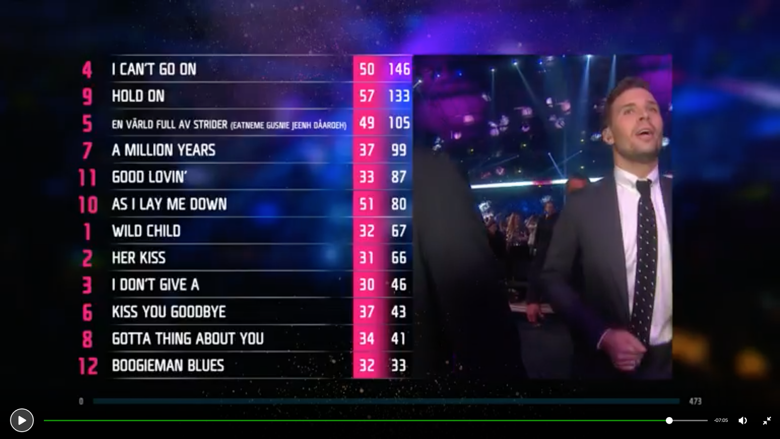 El jovencísimo Anton Hagman ya está en la historia como el que desbancó a Su Majestad Loreen del trono de Melodifestivalen 2017. Pero a pesar de su gancho en cámara, su tema flojito y su escenografía sencilla no consiguieron despertar el interés del jurado (11º). El público lo aupó hasta el sexto lugar, pero su puesto final fue décimo. Tiene juventud suficiente como para escoger una canción de mayor nivel y volver a estos escenarios. Cumplió con nuestro pronóstico: entre el 7º y el 10º.