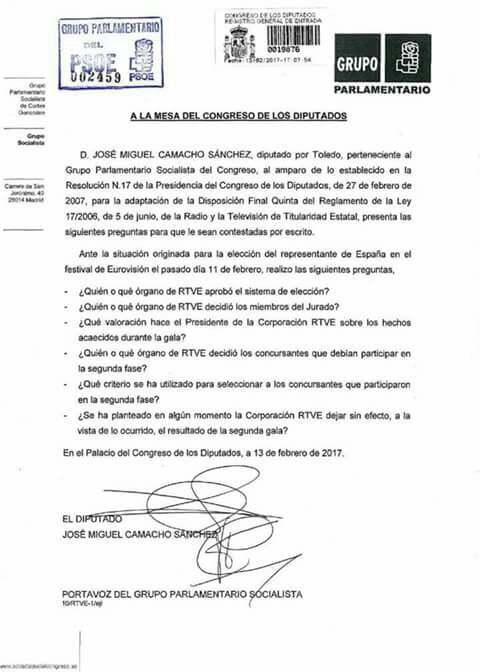 El escándalo ha llegado al plano político, si ayer UPyD pedía el cese de los responsables de la gala, hoy el diputado del PSOE por Toledo, José Miguel Camacho Sánchez ha presentado en el Registro del Congreso de los Diputados una batería de preguntas sobre la preselección.